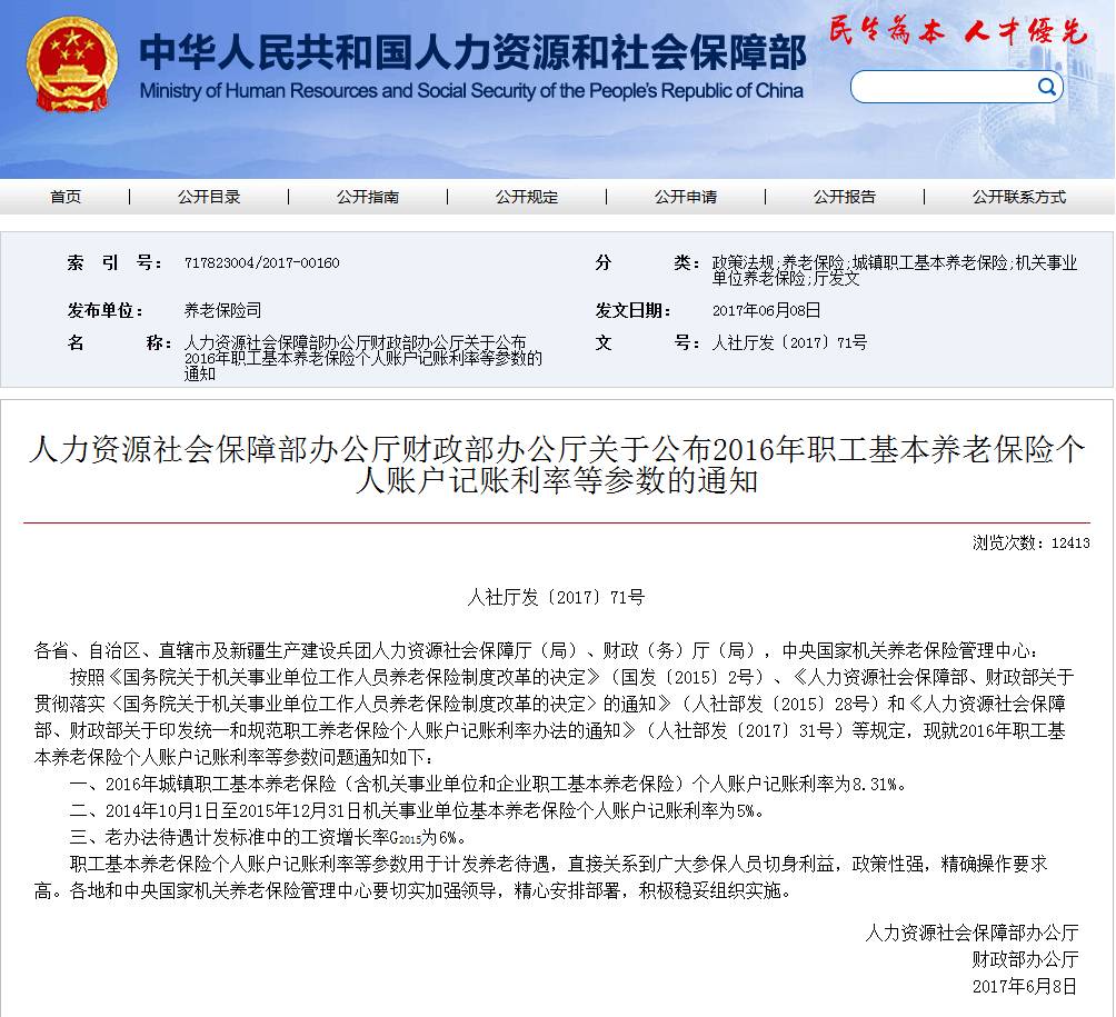 近日,辽宁省财政厅和辽宁省人力资源和社会保障厅转发了《人力资源社会保障部办公厅财政部办公厅关于公布2016年职工基本养老保险个人账户记账利率等参数的通知》(人社厅发〔2017〕71号)文件。其中提到,2016年城镇职工基本养老保险(含机关事业单位和企业职工基本养老保险)个人账户记账利率为8.31%。